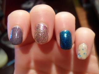So before I took it off I thought I'd try some layering. I wasn't really happy with any of these. From index to pinky - Butter London No More Waity, Katie, OPI Sparkle-icious (I think) , China Glaze Dorothy Who, and Deborah Lippmann Glitter in the Air. Out of the four, Glitter in the Air is the only one I'd consider doing again.